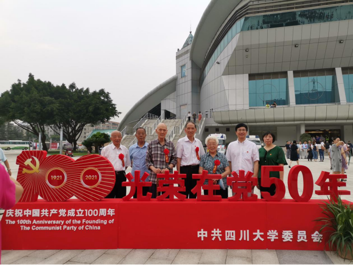 在中国共产党成立100周年之际,党中央首次向党龄达到50年、一贯表现良好的党员颁发“光荣在党50年”纪念章。6月23日,学校“光荣在党50年”纪念章颁发仪式在望江校区体育馆隆重举行。校党委书记王建国、校长李言荣等全体校领导,“光荣在党50年”的老党员,基层党组织书记,学校相关单位负责人以及青年党员代表参加仪式。中心5位老党员到现场参加仪式,党总支书记侯贤灯、离退休支部书记韩英带队参会。