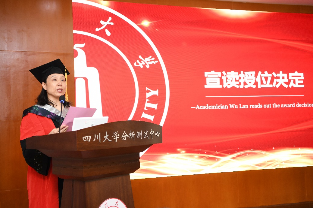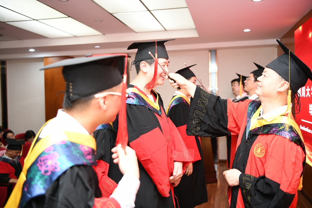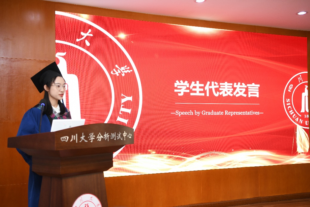 博士研究生金蜀鄂、硕士研究生苟丽晨先后代表全体毕业生发言,他们回忆了求学之路所经历的挫折与坚持、收获与感动,鼓励在座的学弟学妹们继续奋斗,在自己的领域发光发热。随后,中心党总支书记吴兰教授宣读授位决定,5名毕业生获得博士学位,10名毕业生获得硕士学位。最后,中心侯贤灯教授、吕弋教授和李玉宝教授一起为全体毕业生拨穗并颁发学位证书。