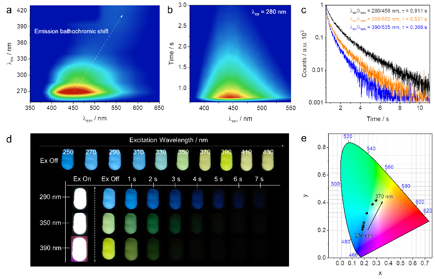 图1.α-AlF3激发依赖、颜色可调的长寿命磷光发射
