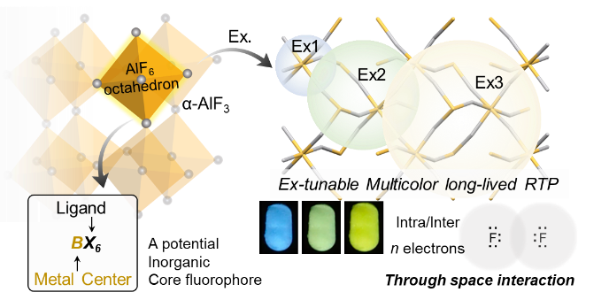 α-AlF3具有三维类钙钛矿结构,其由AlF6八面体通过配体顶点相连的方式形成三维结构。与基于BX6八面体的卤化物钙钛矿类似,α-AlF3的发光表现出自陷态激子发射特征。此外,在AlF6八面体结构中,F原子之间相互靠近,导致其n电子产生了较弱的空间共轭,进而诱导产生了簇发光(n→σ*跃迁)。簇发光是发现于富含n电子的非传统有机发光体中的一种新的发光现象,同样具有激发依赖颜色可调的磷光性质。值得一提的是,该团队还通过对磷光测试方法的更新和改进,发现了簇发光区别于传统发光的压力诱导磷光增强现象。