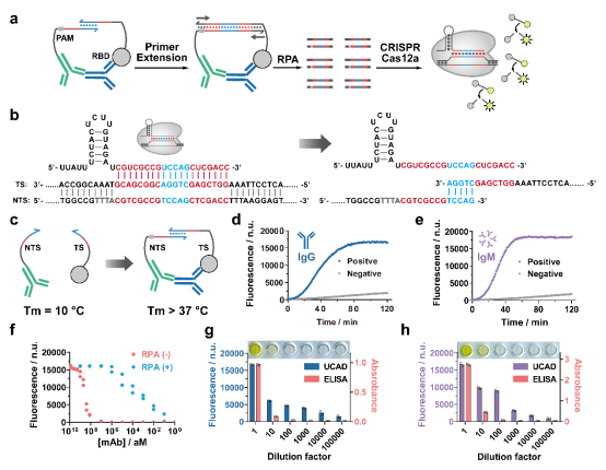 为突破蛋白质检测灵敏度低且操作复杂这一技术瓶颈,中心唐娅楠副研究员近日在Nature Communications上以共同第一作者发表了相关工作进展。该工作利用新型蛋白质-DNA分子传译器,成功将血清中的新冠抗体转换成预设核酸序列输出,并与等温核酸扩增技术及CRISPR-Cas12核酸诊断技术结合,实现信号的扩大和检测。该技术无需样品分离,无需变化温度,所有反应均在均相溶液中进行,因此大大简化了抗体检测的操作步骤。此外,该技术检测限为10 aM,可与核酸检测灵敏度媲美,并可用于新冠感染的早期抗体筛查和免疫缺陷病人的疫苗接种有效率评估,为该类人群个性化设计疫苗接种提供依据。