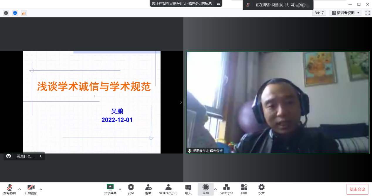 吴鹏研究员以《浅谈学术诚信与学术规范》为题,结合近年来国内外学术不端实例和自身科研工作体会,向同学们介绍了引用文献、常识、实验数据等各个科研环节易忽视的学术不端行为,生动详实地阐述了学术诚信的重要性,并强调科研工作要坚守科学精神和科研操守,不能急功近利。