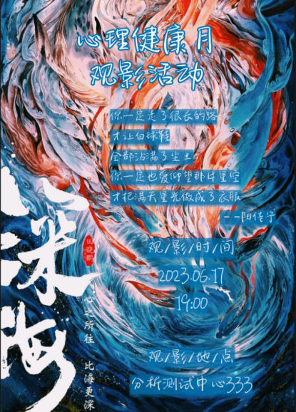 本次观看电影为《深海》,主要讲述一个患抑郁症的女孩冲破黑暗,寻找光明的故事。观影结束后,同学们发掘纷繁电影中蕴含的心理健康知识与人生哲理。“深海”不只是这片海,不只是深海号,它还是每个人心中的那片海。每个人心中或多或少都埋藏着一段不被理解的时光,但要相信:纵使生活万般不如意,但阳光洒落时,也会风平浪静。哪怕只有一丝光,就代表还有希望。