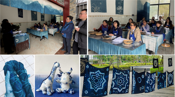 蓝染是我国传统非物质文化遗产,以植物靛蓝为染料,通过扎染等技法在织物上创造独特纹样,其工艺可追溯至秦汉。午饭后,教职工们沉浸式体验了古法蓝染,通过捆扎、浸染、清洗、晾晒等一整套流程,成功制作出独一无二、各具特色靛蓝纹样的帽子、方巾、玩偶等作品。巧手染蓝韵,匠心得传承。现场气氛热烈而欢快,千年非遗在指尖焕发新活力,不仅舒缓了工作压力,更深化了对传统文化的理解。
